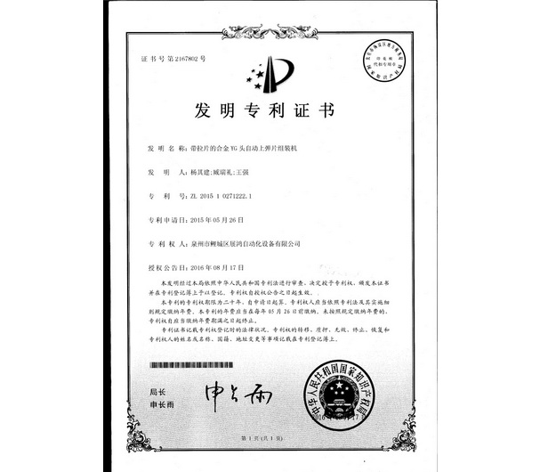 YG頭專利證書